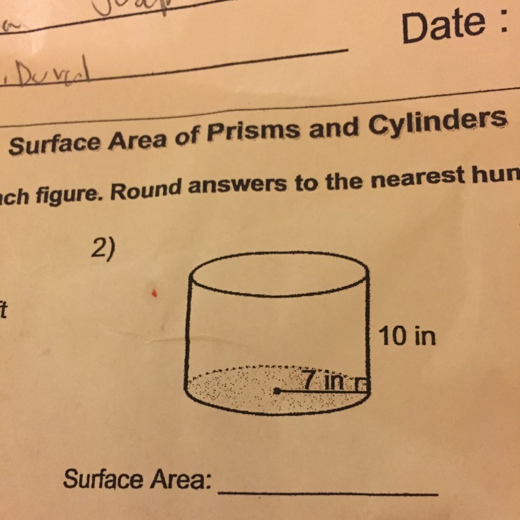 →  S.A.  =  2 (3.14) * (7 in.)²   +    2 * (3.14) * (7 in) * (10 in)  ;