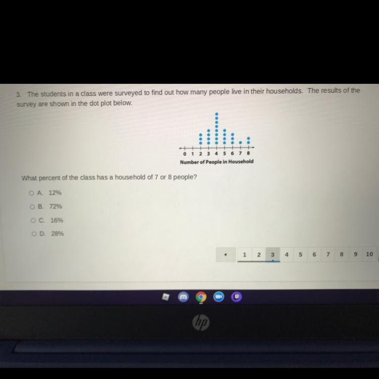 First we need to count the total number of dots. This equals the number of people who were surveyed. There are 25 of them. Now we need to count the number of people shown above 7 and 8. There are 3 total. To figure out the percentage we divide 3 by 25. 3 / 25 = 0.12. This equals 12 percent.