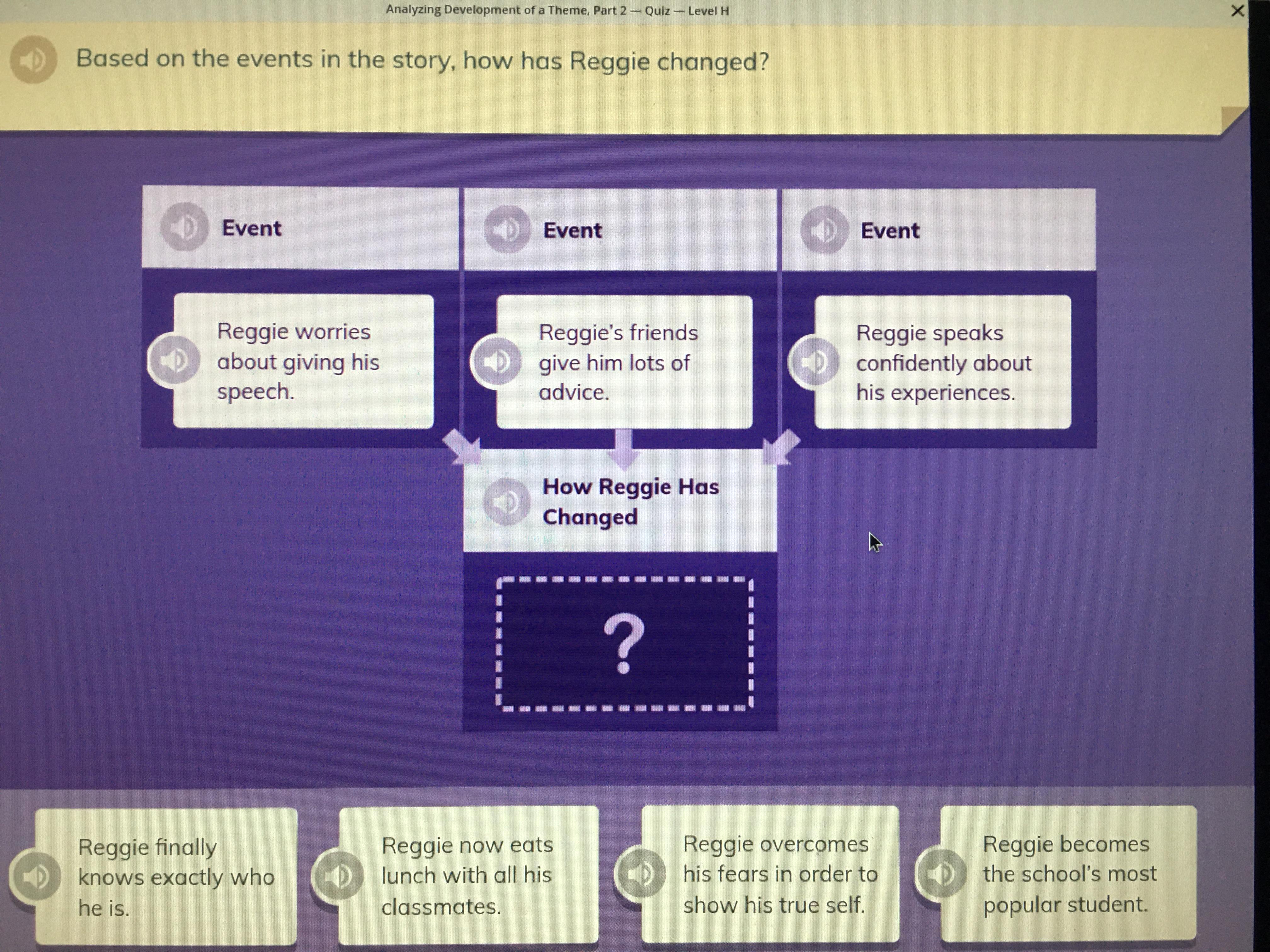The 3rd option is correct “Reggie overcomes his fears in order to show his true self”.