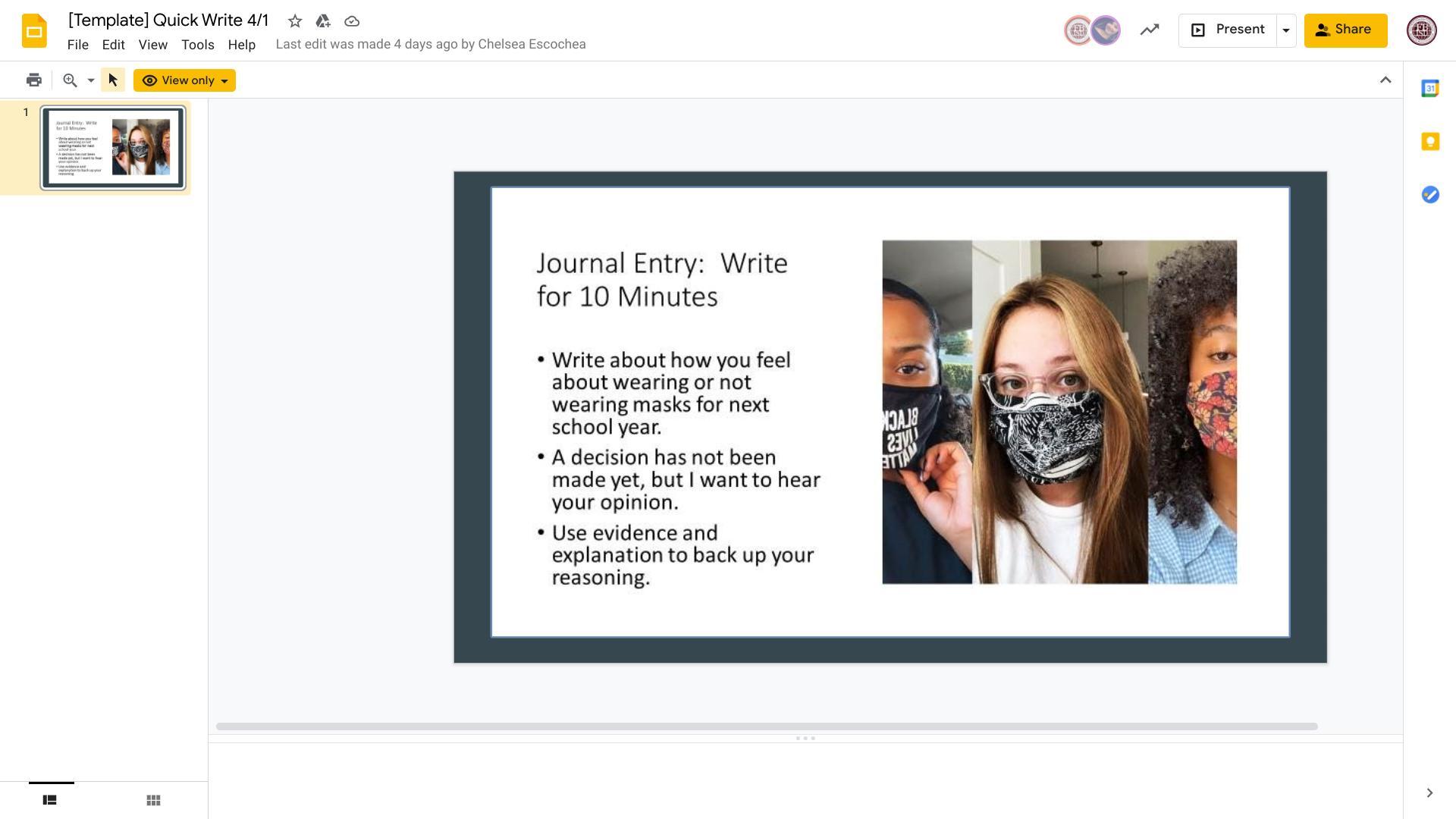 I believe we should continue wearing masks for the next school year. Even though cases are decreasing, There is still a risk of infection. In order to protect ourselves and others we should continue wearing masks.