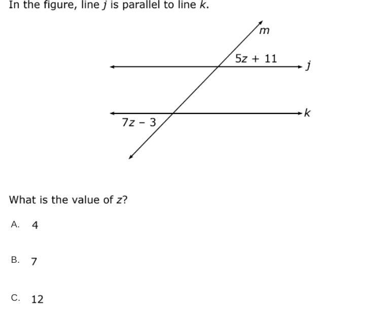 1. Since A and B are parallel, angle 3x+7 and angle 4x+5 are same-sided exterior angles. That means that they both add up to 180 degrees. So if you should add the two and make it equal 180