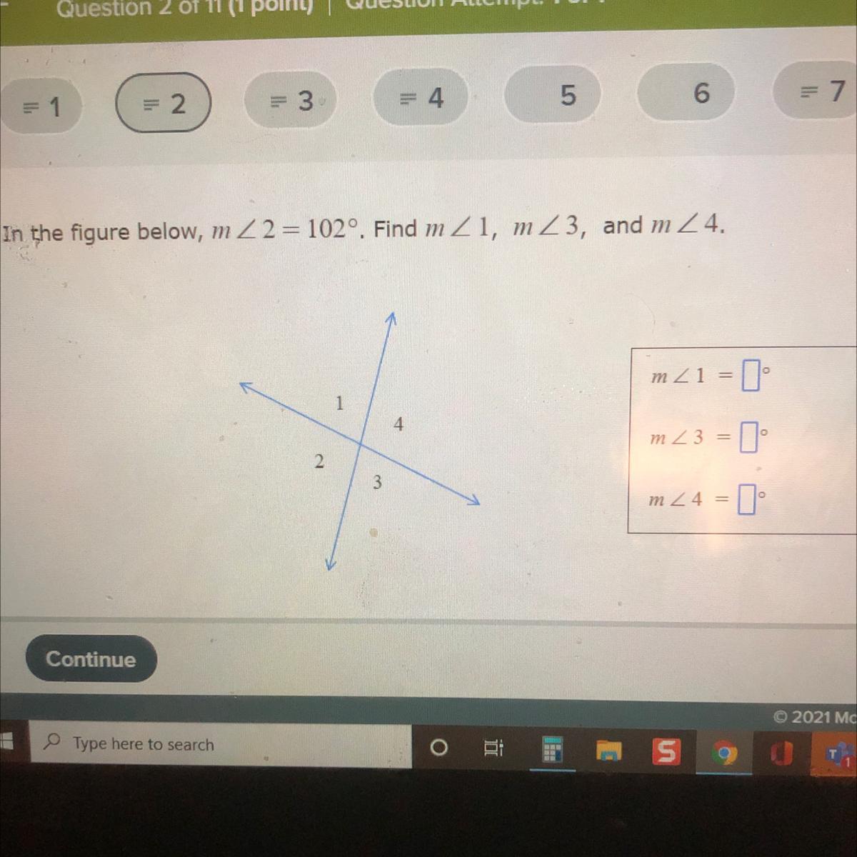 <4: 102 because it is vertical to <2, and all vertical angles are congruent