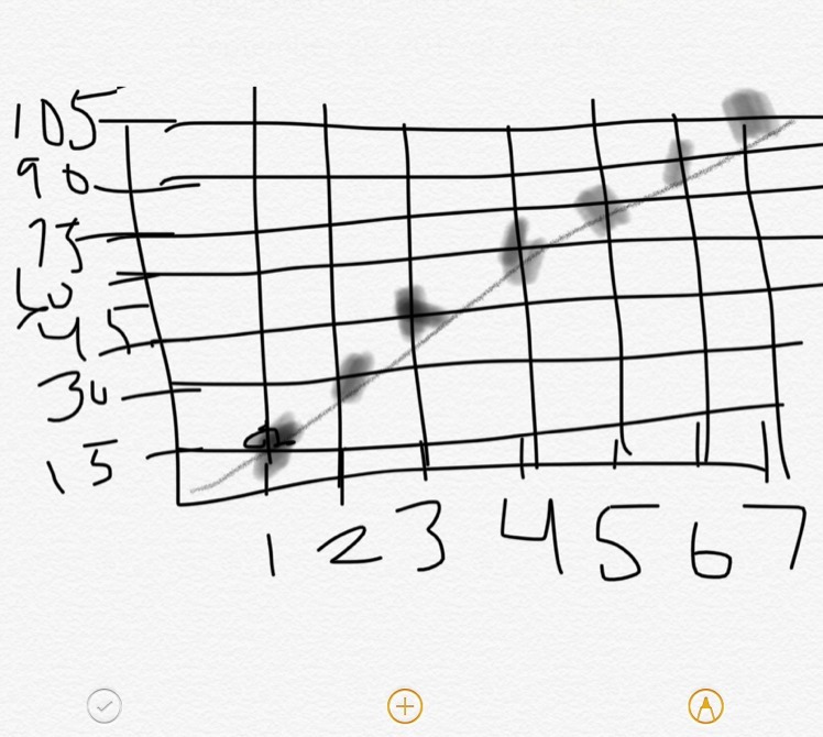 Okay. So by looking at this and doing mental math, it takes her 15 minutes to walk 1 mile. So for her to walk 7 miles, it will take her 105 minutes or 1 hour 45 minutes to do so. Here’s the double line diagram to support my answer (forgive me for the terrible writing).