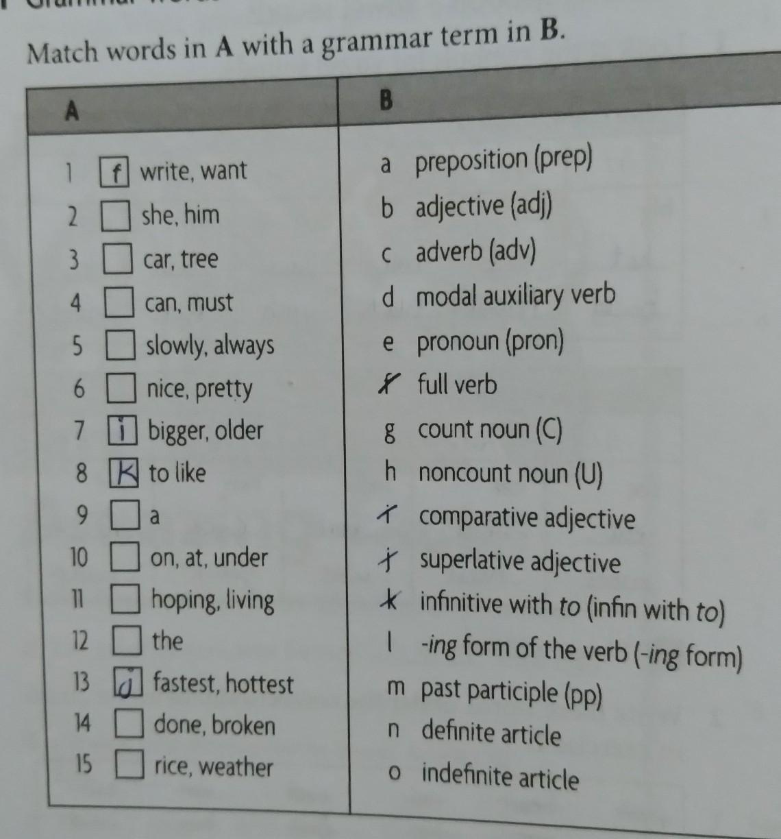 From the excerpt, I have been able to match words in A with a grammar term in B.
