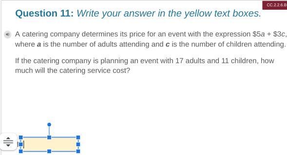 The equation 5a + 3c is provided to determine the cost of a catering event, where a is the number of adults and c is the number of children.
