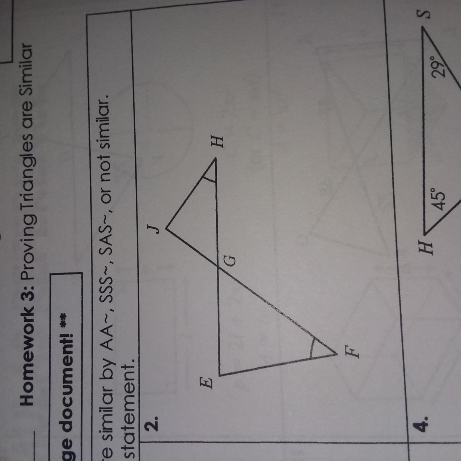 Since two angles of triangle EFG and two angles of triangle GHJ are equal, then the two triangles are said to be similar by AA similarity theorem.