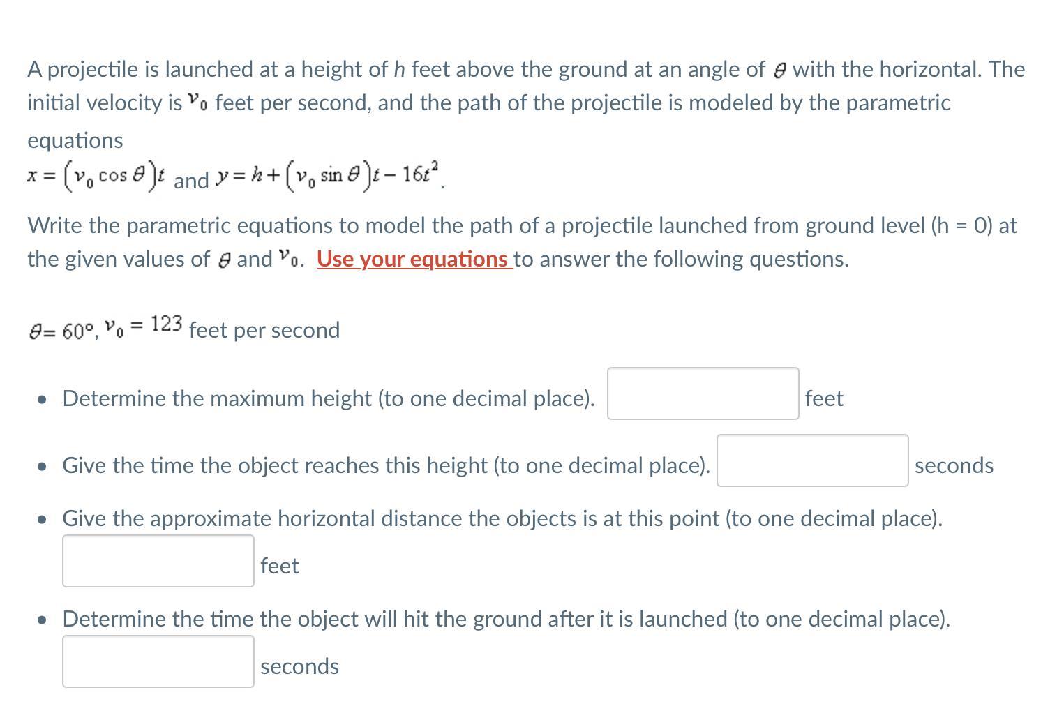 • y = h + (v₀sinθ)t - 16t² = 0 + (123 sin 60°)t - 16t² = 106.52t - 16t²