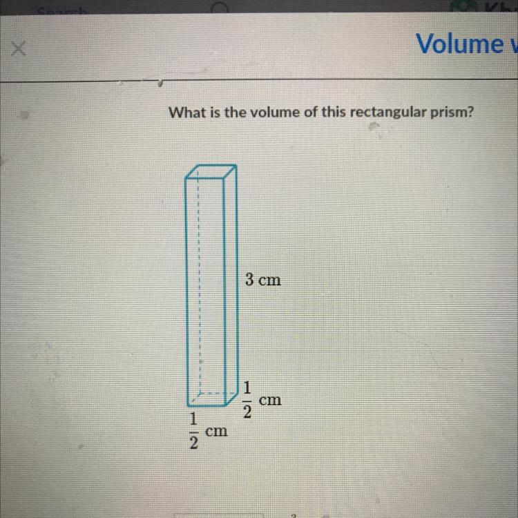 Volume = base area * height. Where base area is 1/2*1/2 (As it is a square) and height = 3 cm, so times together get 3/4.