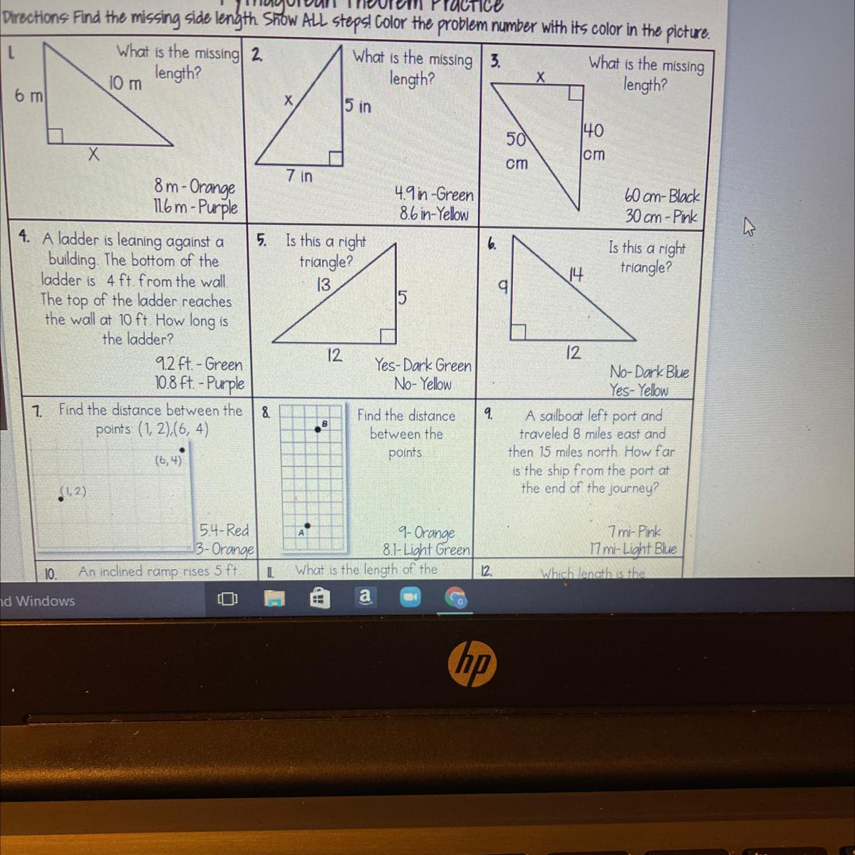 So what the paper wants you to do is utilize the Pythagorean Theorem, to find the answer to each question, and whatever answer that turns out to be, you'll color the square with that color.