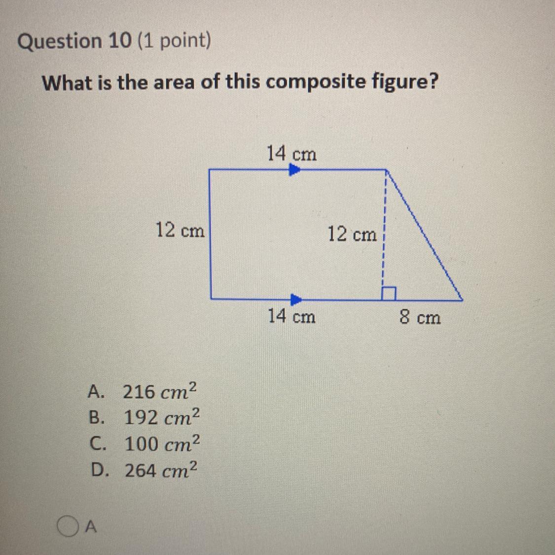We can split this composite shape into two different shapes: A Rectangle and a right angled triangle. Area of rectangle: Length * Width = 12cm * 14cm = 168cm^2