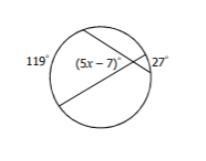 (5x - 7) \degree =  \frac{1}{2} (119 \degree + 27 \degree) \\  \\ (5x - 7) \degree =  \frac{1}{2}  \times 146 \degree\\  \\ (5x - 7) \degree = 73\degree \\  \\ 5x - 7 = 73 \\  \\ 5x = 73 + 7 \\  \\ 5x = 80 \\  \\ x =  \frac{80}{5}  \\  \\ x = 16