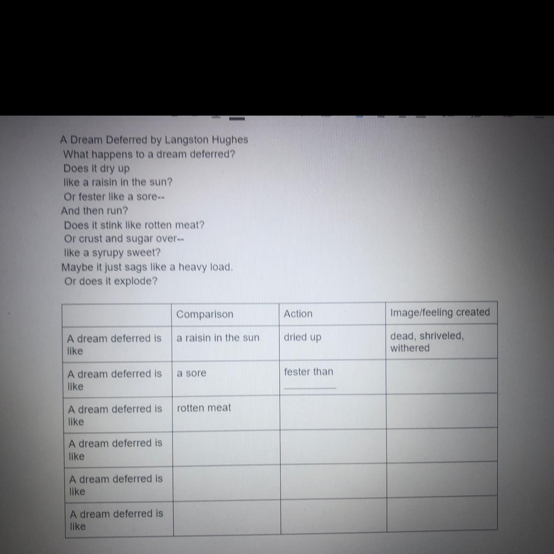This question is about the poem "Dream Deferred" by author Langston Hughes. Hughes was an important name in the African-American movement known as the Harlem Renaissance, which took place in the 1920s and 1930s. The poem's theme revolves around the oppression suffered by African Americans - an oppression that often suffocated, sometimes even killed their dreams. That is what Hughes explores with the comparisons he makes in the poem. A dream that is never fulfilled probably becomes something else - maybe just a beautiful, sweet thought, maybe a stinky, heavy bitterness.