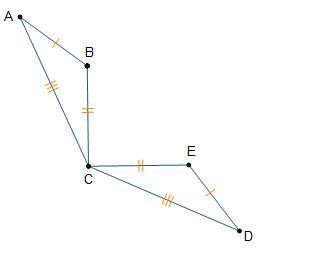 The triangles are congruent by the SSS congruence theorem. Triangles A B C and D E C are connected at point C. Triangle A B C is