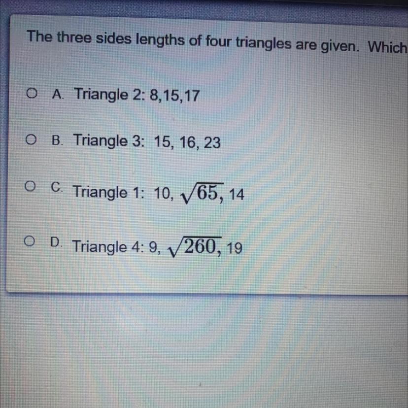 The three sides lengths of four triangles are given. Which triangle is a right triangle?