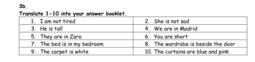 1. Yo no estoy cansado. 2. Ella no está triste. 3. Èl es alto. 4. Nosotros estamos en Madrid. 5. Ellos están en Zara. 6. Tu eres pequeño. 7. La cama está en mi cuarto. 8. Èl gavetero está al lado de la puerta. 9. La alfombra es blanca. 10. Las cortinas son azules y rosa.