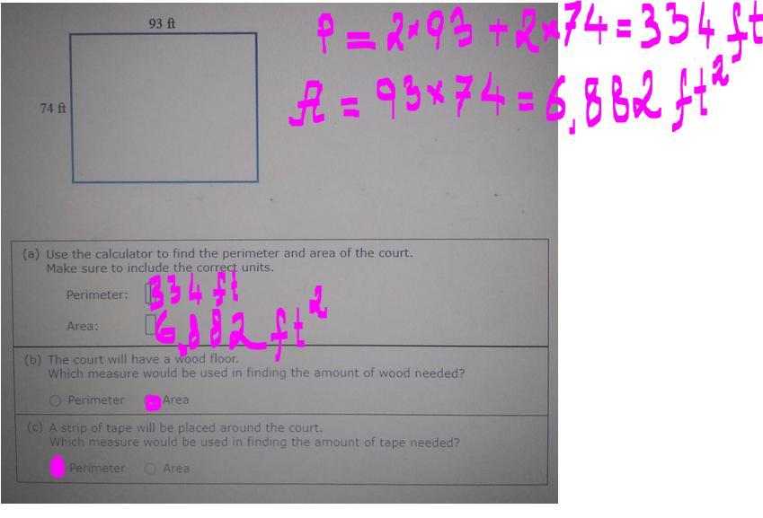 perimeter = 74+74+93+93 = 334 ft