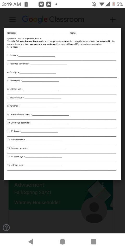 1. Tú llegabas 2. Yo iba 3. Nosotros comíamos 4. Yo salía 5. Elena tomaba 6. Ustedes eran 7. Ellos escribían 8. Tú tenías 9. Los estudiantes saltaban 10. Olivia y yo estábamos 11. Tú llevabas 12. Marco volvía 13. Nosotros veníamos 14. Mi padre oía 15. Ustedes leían