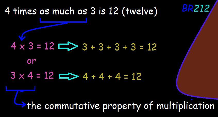 Keywords: 4 times as much as 3, 12, twelve, multiplication, basic operations, addition, terms, the commutative property of multiplication