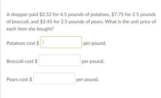 To find the price per pound of the potatoes, we will need to divide $2.52 by 4.5 to find out how much one pound costs:
