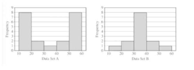 a. The standard deviation of data set A is greater than the standard deviation of data set B.