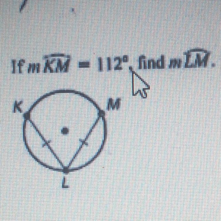 The answer is 124 All circles are equal to 380 degrees You’re alr told that a part of the circle is equal to 112 So you subtract 360-112 which is 248 This means that the rest of the circle (without the zone that KM covers) is 248 As you can see both sides (ML and KL) are equal because they have congruency lines So both sides have the exact same length If what’s remaining is 248 and there are 2 equal sides you just have to divide 248/2 and that is 124