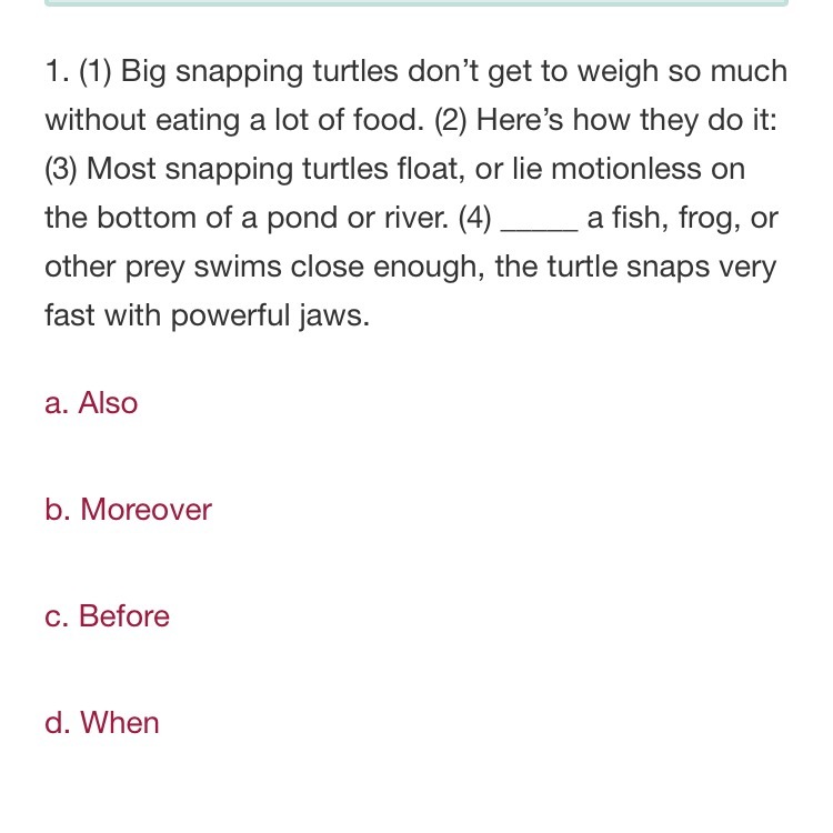 Sentence 2 and 3 go hand in hand by explaining sentence 1. Sentence 3 is explicitly telling you what is going to happen, so the transition for sentence 4, would have to be a continuation of what would need to happen for the turtle to snap.