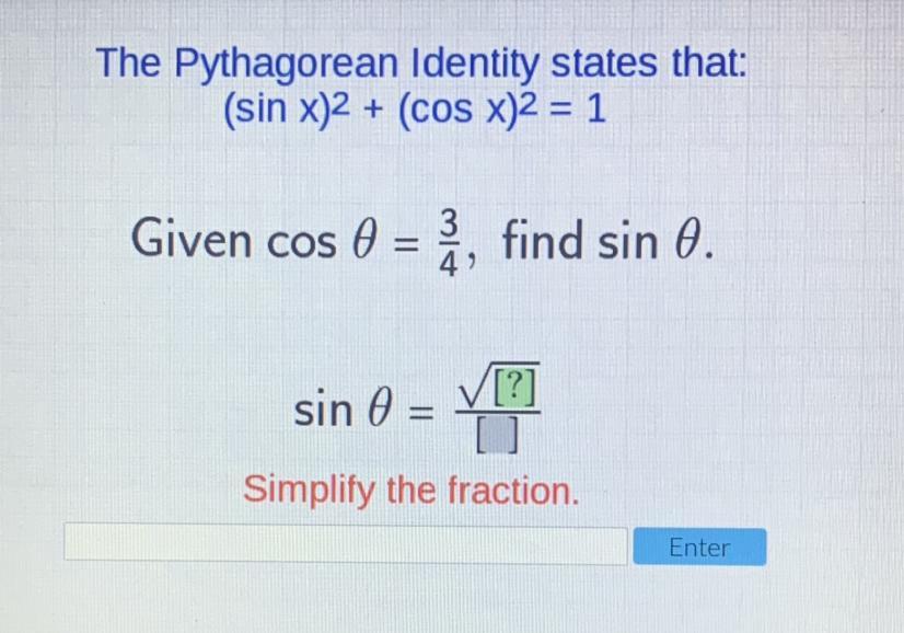 Therefore, cosΘ = adjacent / hypotenuse = 3 / 4
