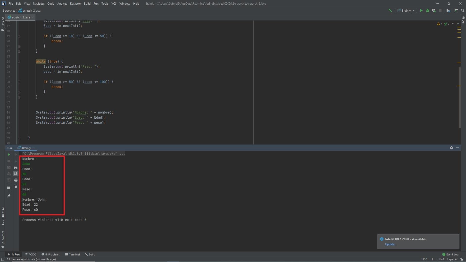 El codigo solicita los datos y los analiza. Si estan bien continua, sino los vuelve a solicitar. Cuando esten todos los datos bien los imprime.