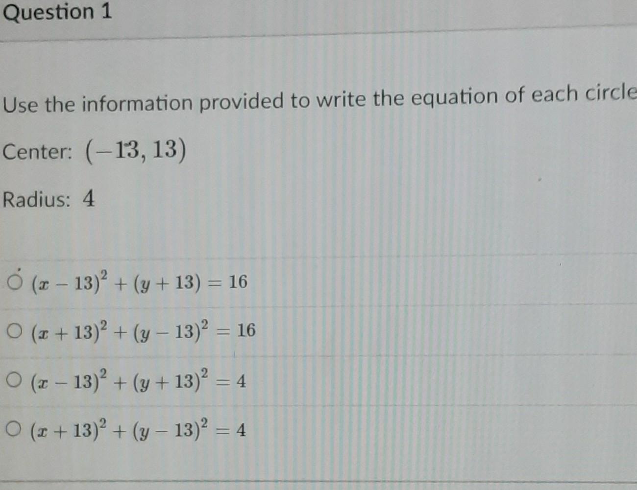 Use the information provided to write the equation of each circle. Center: (-13, 13) Radius: 4​