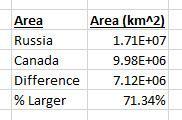 Russia/Canada = (1.71x10^7/0.998x10^7) {Move the decimal point for Canada to make the exponents both equal to 7.