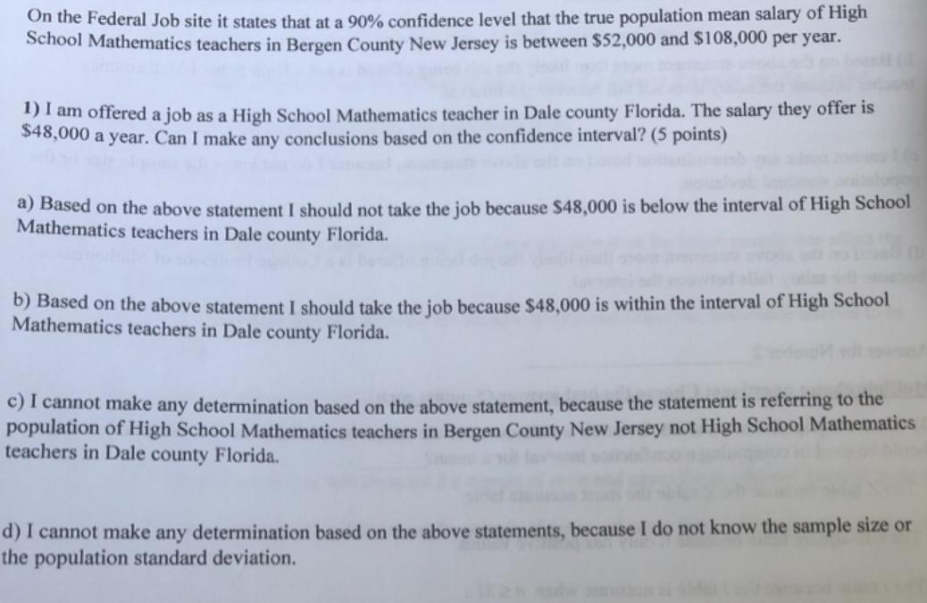 teachers in Bergen County New Jersey is between $52,000 and $108,000 per year. 9) I am offered a job as a High School Mathematics teacher in Dale county Florida. The salary they offer is $48,000 a year. Can I make any conclusions based on the confidence interval