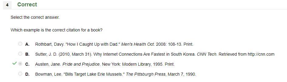 The answer for this question would be C. Austen, Jane. Pride and Prejudice. New York: Modern Library, 1995. Print.