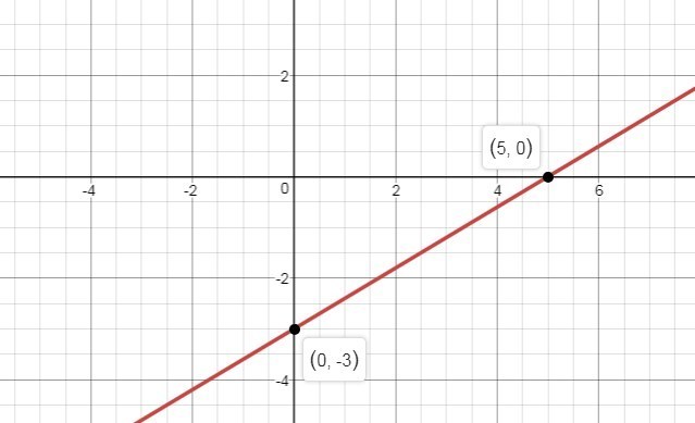 Therefore, the x-intercept is (5, 0), and the y-intercept is (0, -3).