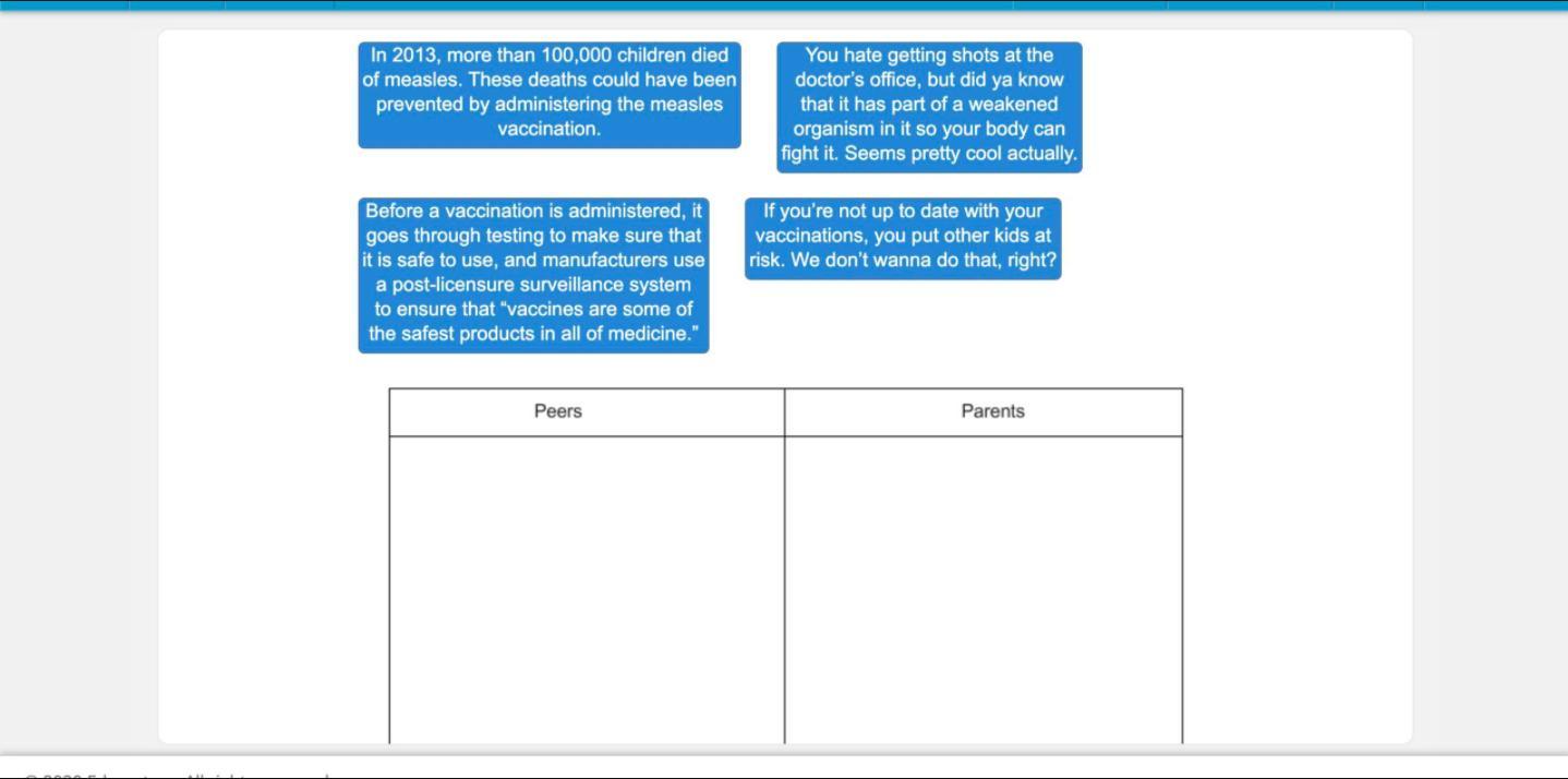 When Jacquelin is reading her essay to her peers, you will discover that she will point out the issue of how some young people hate going to the doctor's office. Most children hate being injected. Also, the second sentence under Peers shows that this part of the speech will be presented to her peers because she talks of the danger of not staying up to date with your vaccinations which may put others at risk.
