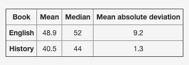 her history book. She takes a random sample of 25 pages in each book, then calculates the mean, median, and mean absolute deviation for the 25 samples of each book.