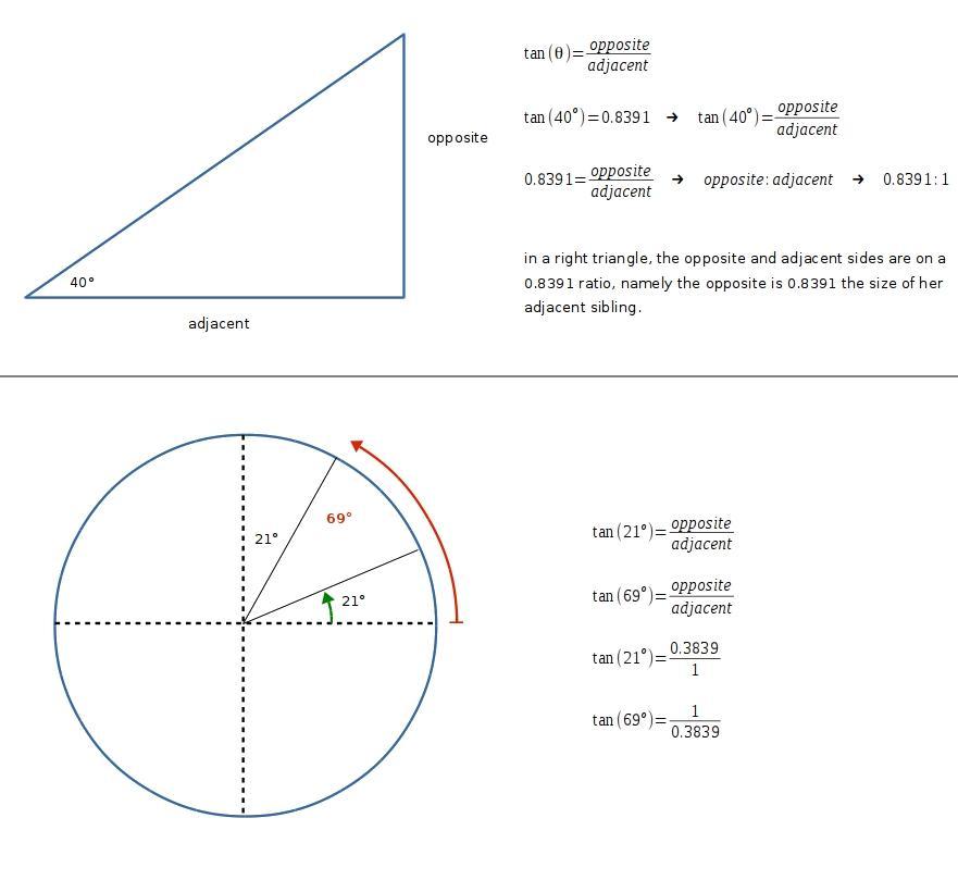 notice, 69° + 21° = 90°, so 21° and 69° are really complementary angles, sharing the same quadrant, meaning for any two sides of lengths say, a,b one angle will have a tangent of say b/a, then the other will have a tangent of a/b.