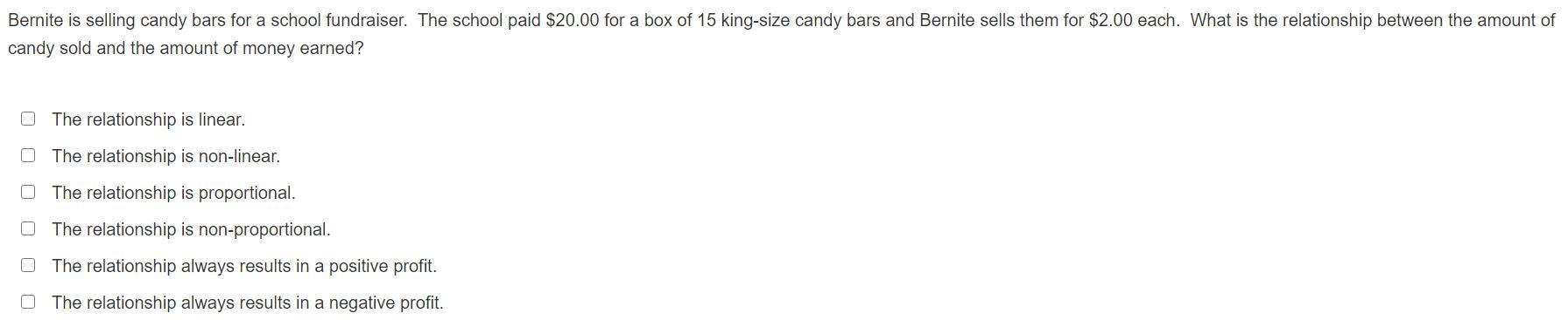 *****SOMEONE PLS HELP***** Bernite is selling candy bars for a school fundraiser. The school paid $20.00 for a box of 15 king-si ze candy bars and Bernite sells them for $2.00 each. What is the relationship between the amount of candy sold and the amount of money earned?