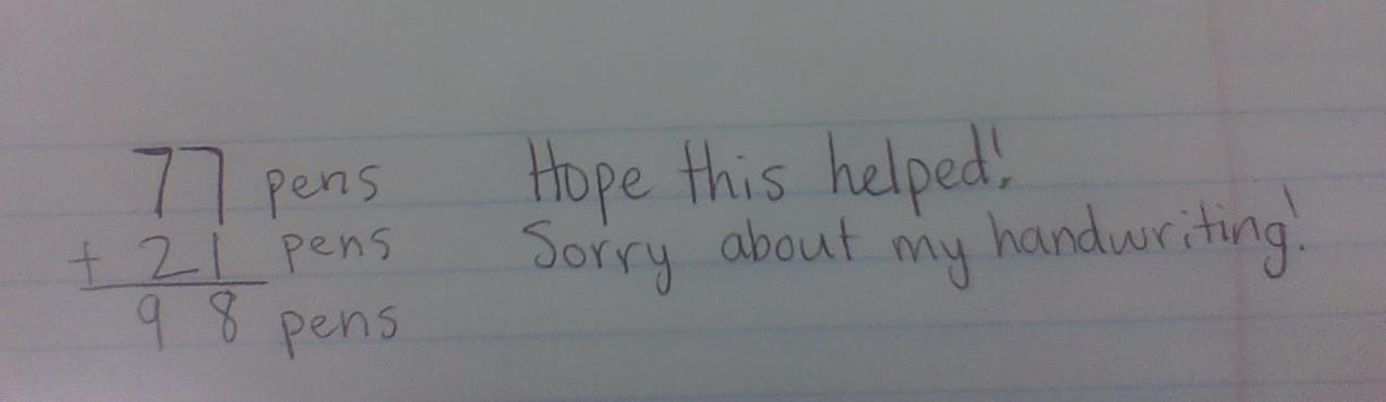 Ms. Ingham took 21 pens from a drawer to distribute to the class. If 77 pens