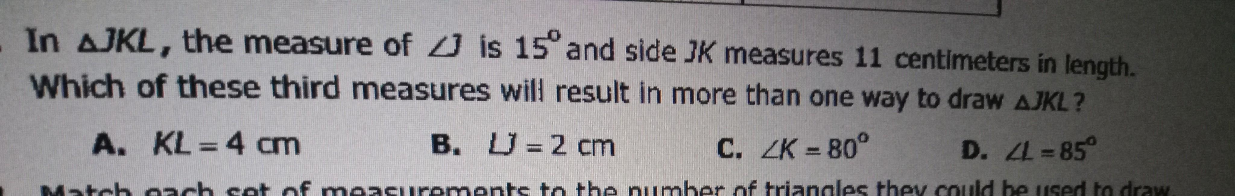Since we got 2 possible case for the angle L, there are two possible set of triangles. Hope this will help you understand more about the problem, comment below if you still have any questions.