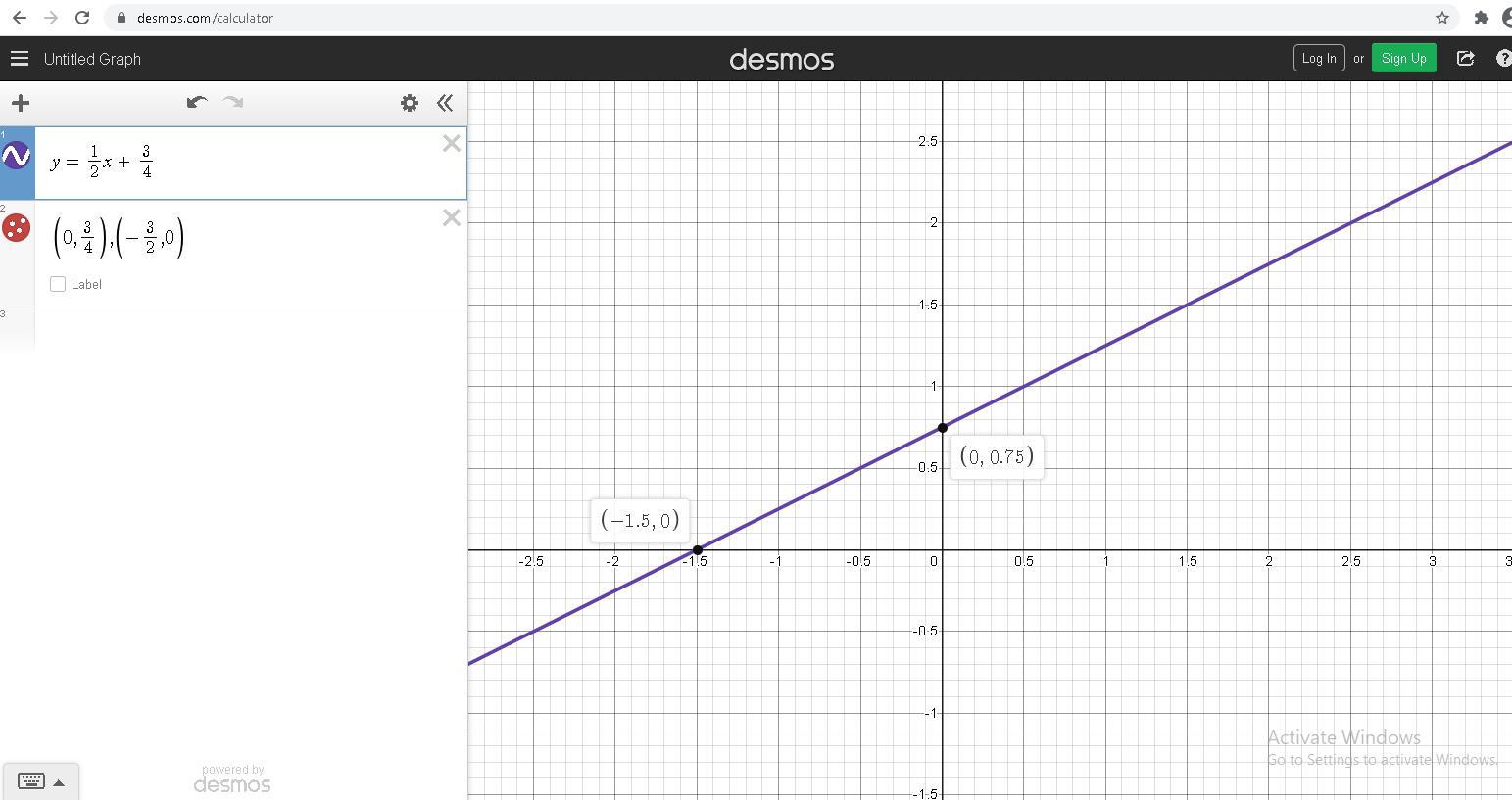 m is the slope which is 1/2 which tells us that if the slope is positive the graph is a positive slope means that two variables are positively related that is, when x increases so does y, and when x decreases y also decreases. Graphically, a positive slope means that as a line on the line graph moves from left to right, the line rises, and b is the y-intercept which is 3/4.