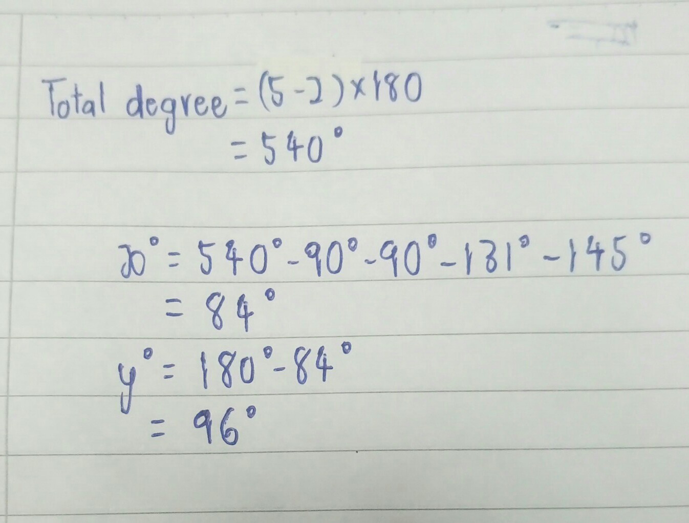 90 + 90 + 145 + 131 + x = 540 => add up the angles