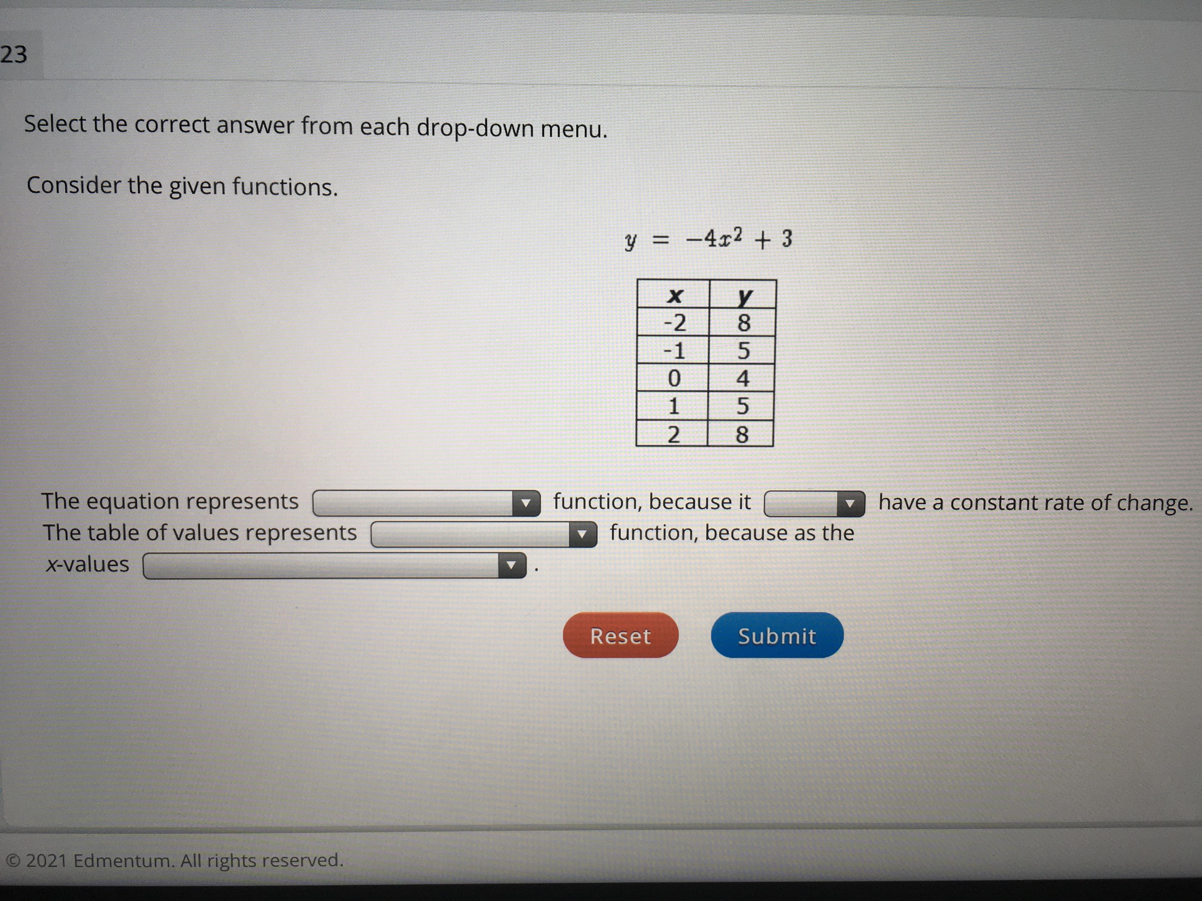 When graphed, nonlinear functions are parabolas. Both the equation and the table will graph as parabolas so they are both nonlinear. Nonlinear functions do not have a constant rate of change. And if you look at the table, when an x value increases, the y value decreases and then increases.