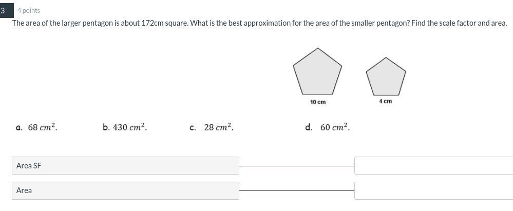 Value 1 x Scale Factor = Area of larger pentagon x 0.4 = 68.8 ≈ 68