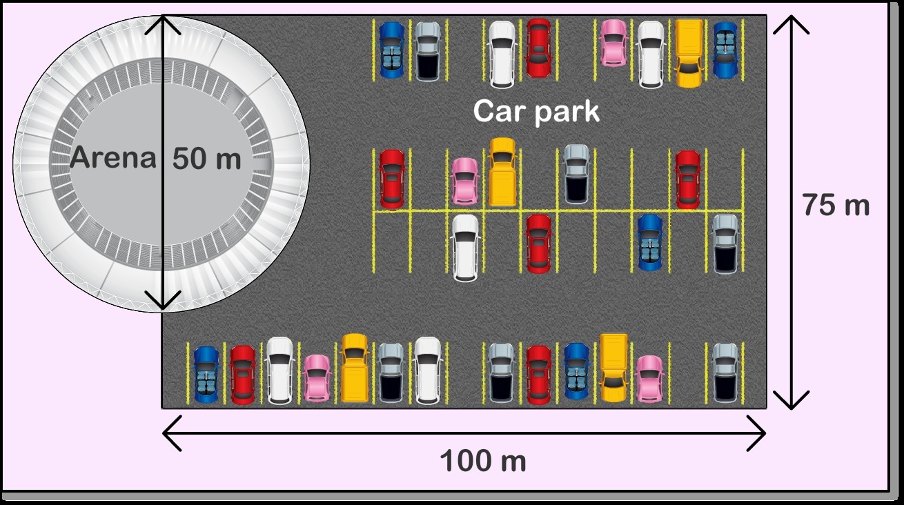 1. Area of car park is area of rectangle (length * width) - area of half circle of arena (half circle area is