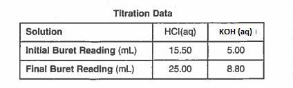 20. Show a correct numerical setup for calculating the molarity of the KOH * (aq) solution. Then state the calculated value of t he molarity .