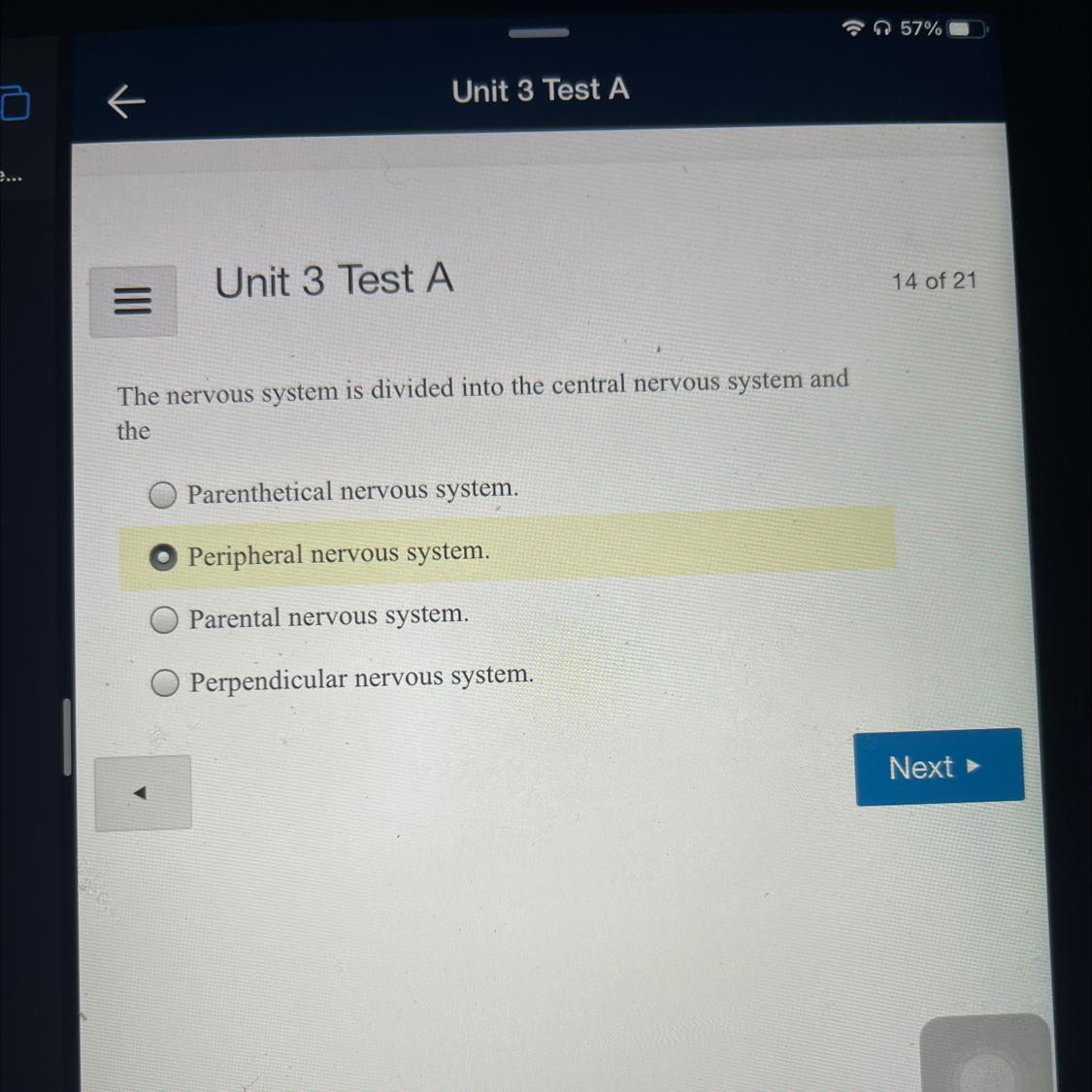 PLEASE HELP ASAP The nervous system is divided into the central nervous system and