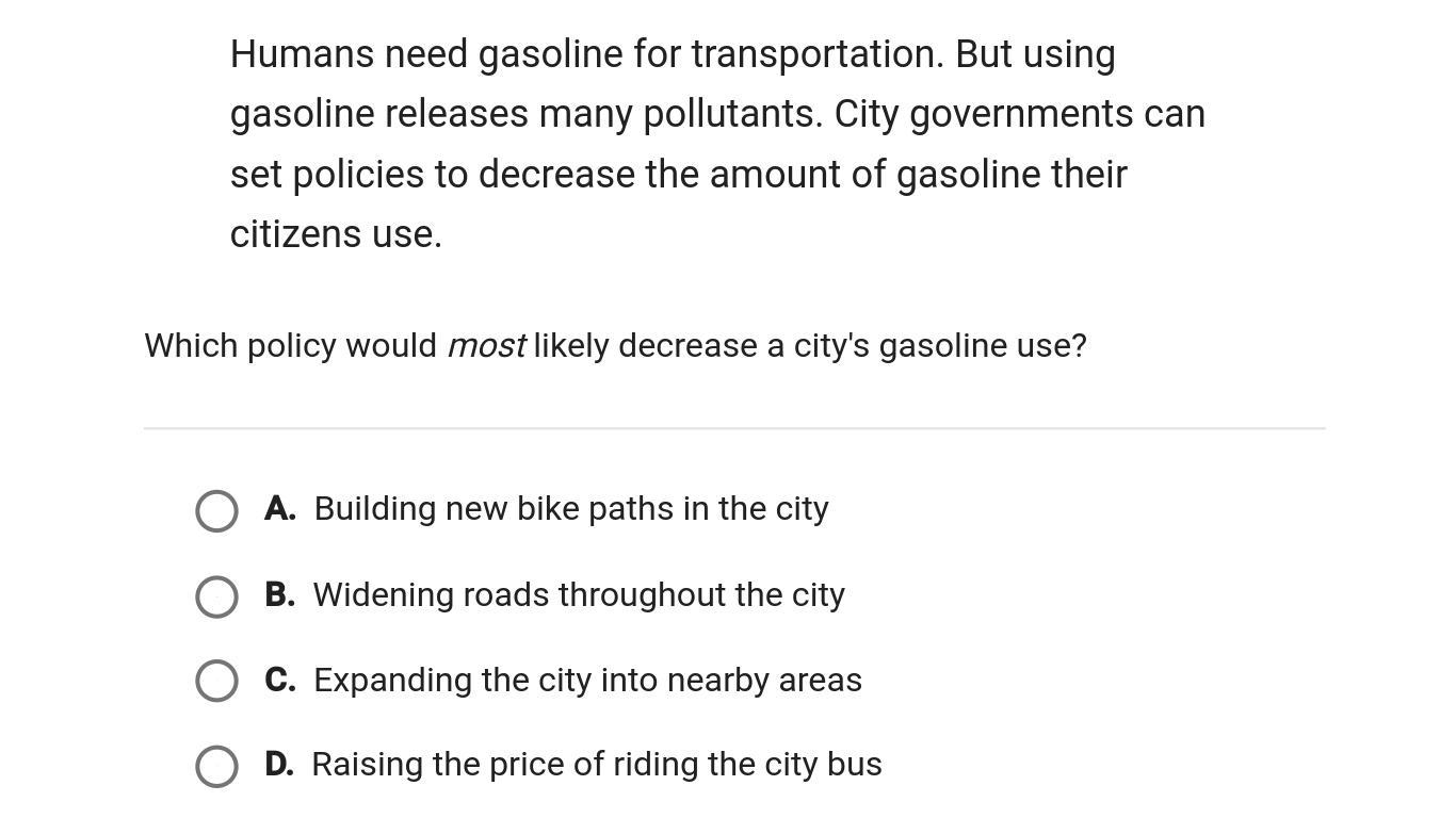 C) false-- similar to above, you will be providing more places in which would require transportation to get to. So, at that rate, it is more likely that you will increase gasoline usage, as the city spreads wider.