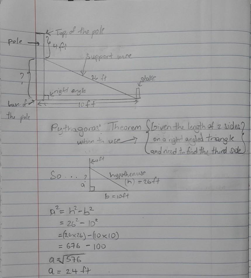 I don't have the best handwriting and it's a bit messy. However, Pythagoras Theorem states that in a right angled triangle, the square of the hypotenuse is equal to the sum of the squares of the other two sides. So, to find the unknown length of one side, you'll subtract the squared length given for the other side from the squared length of the hypotenuse. The hypotenuse is longest side, so I couldn't add the 4ft to the 24ft. I guess it is just 24 ft then.