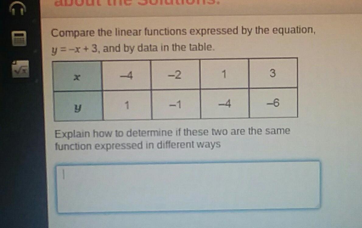 The linear function that is expressed as the equation y = -x + 3, is given in the slope-intercept form, y = mx + b, where