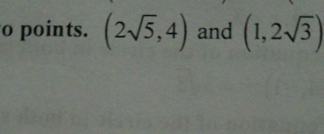 To find the distance between the points you've listed, (2√5,4) and (1,2√3), we'll first need to find the "legs" of the triangle. To find the length of the x leg, we'll just need the distance between the x values of the points, which we find to be 2√5-1. We do the same for the y component, which ends up being 4-2√3. Now that we have our legs, we're ready to find the hypotenuse - or the distance.